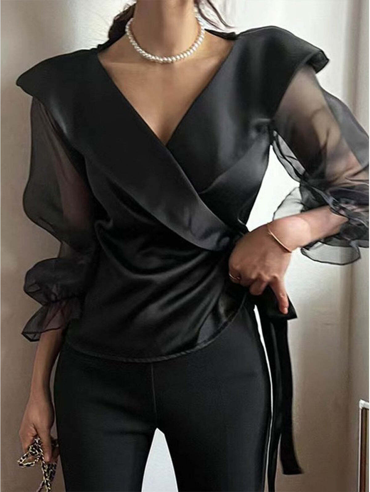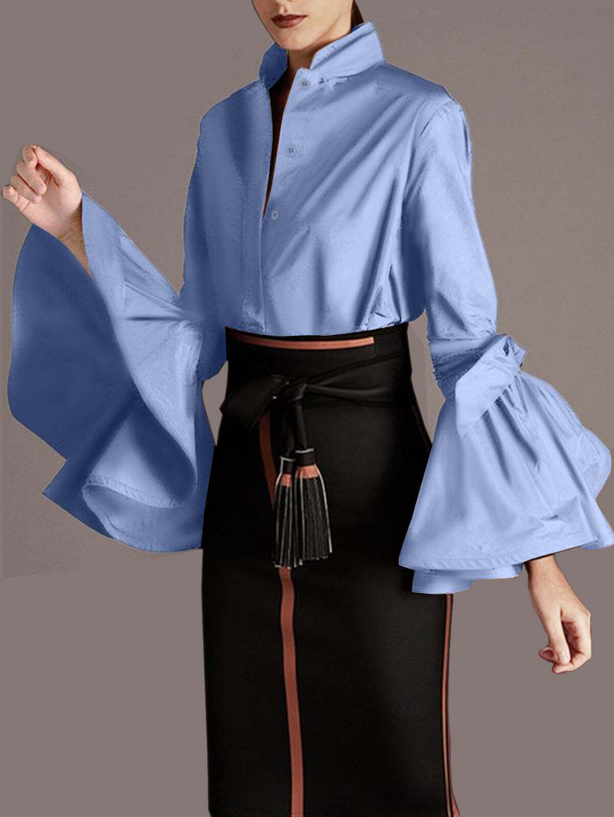Elegant Plain Mock Neck Tie Arm Trumpet Sleeve Shirt
