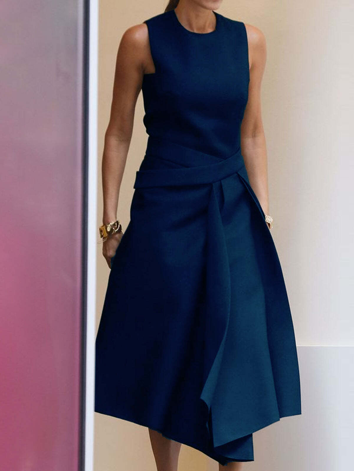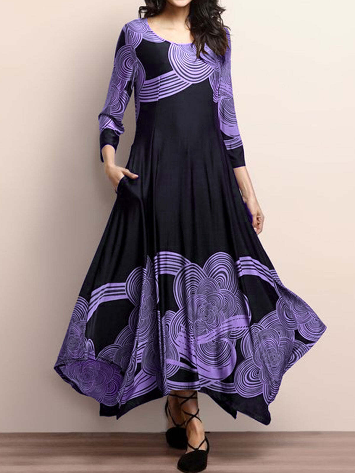 Elegant crew Neck Irregular Hem Midi Dress with Pockets