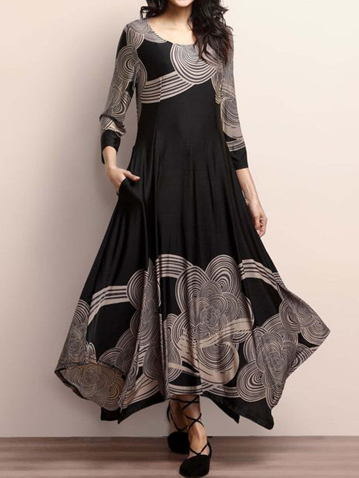 Elegant V Neck 3/4 Sleeve Floor-length Flowy Dress