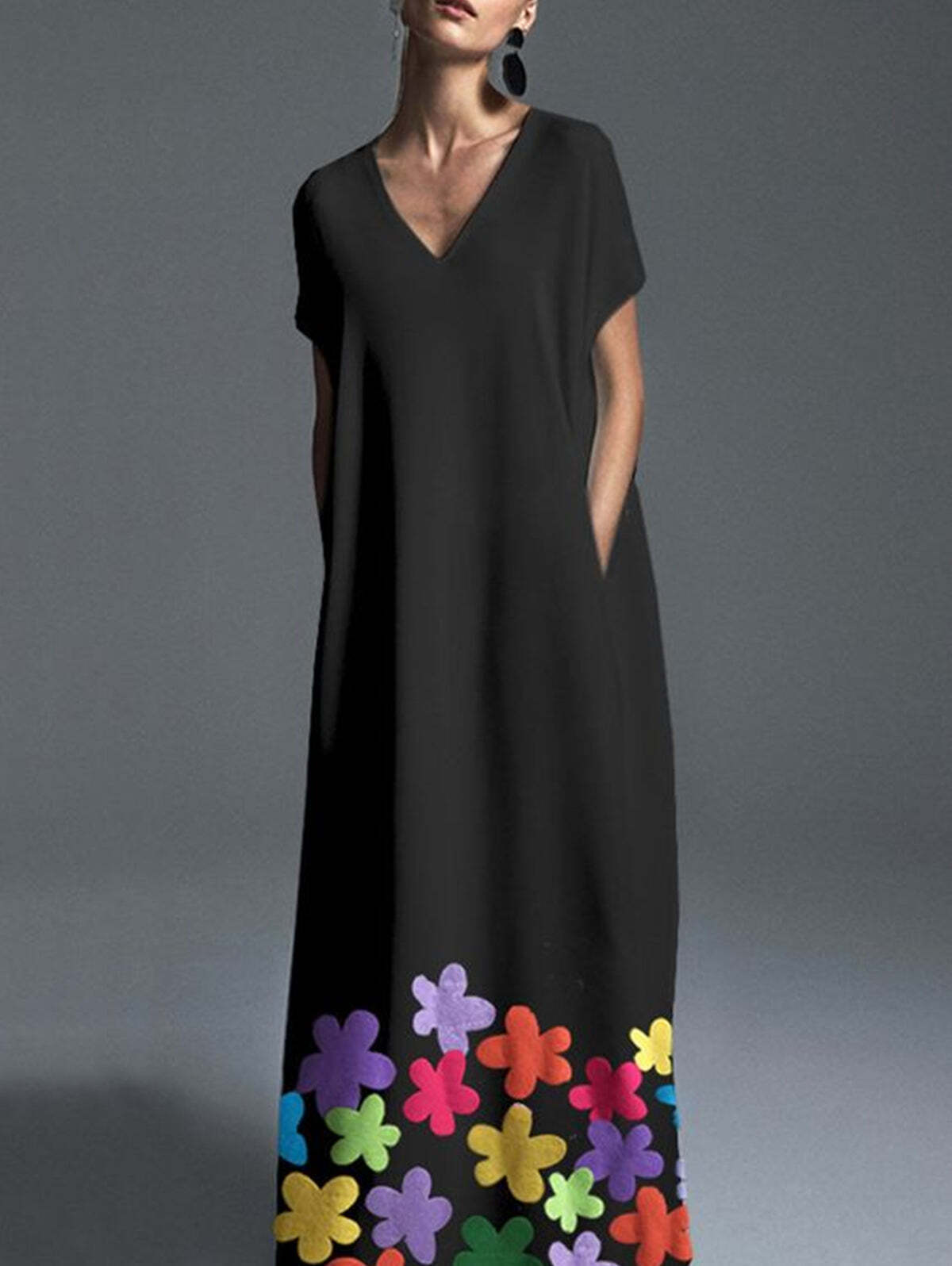 Elegant Plain Floral V Neck Short Sleeve Loose Pocket Maxi Shift Dress