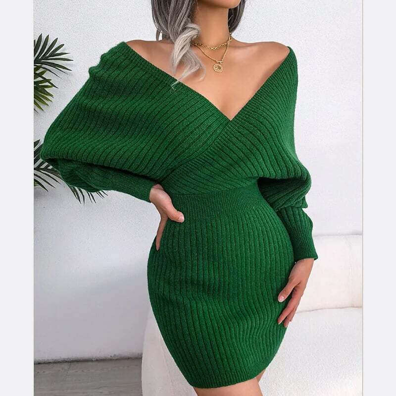 V-Neck Bat Dress Hip Wrap Dress Woolen Dress