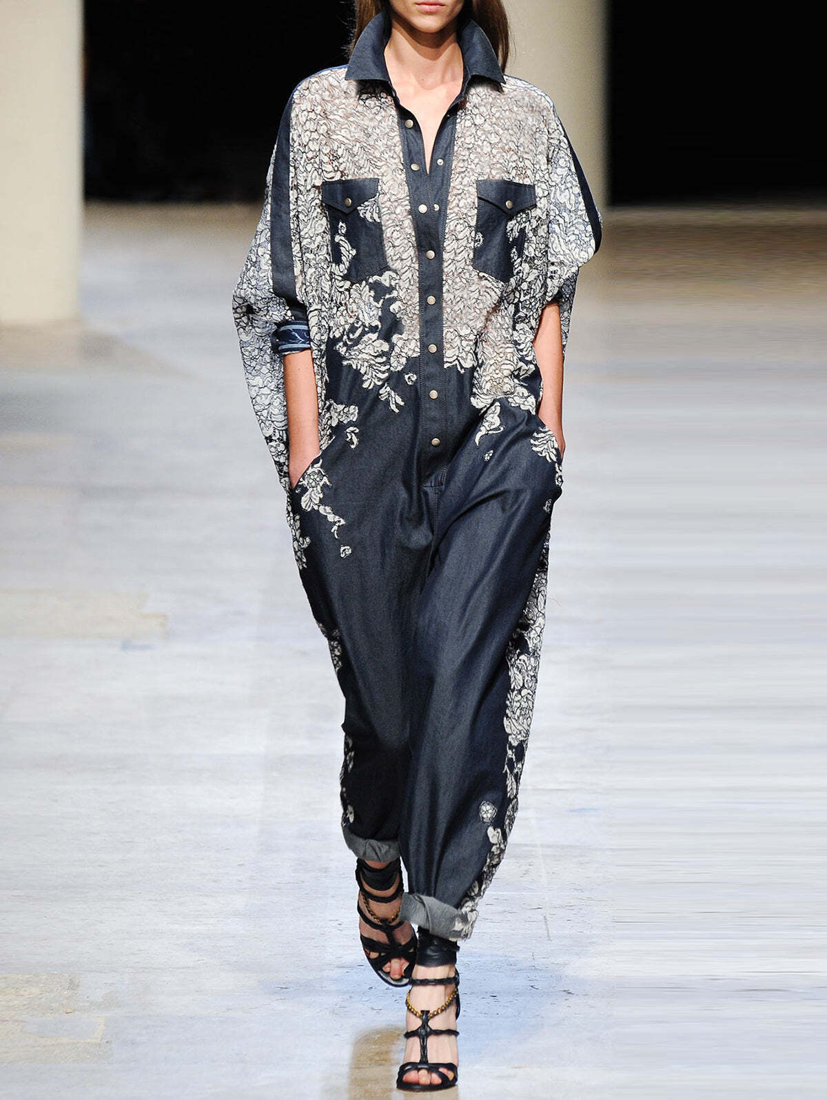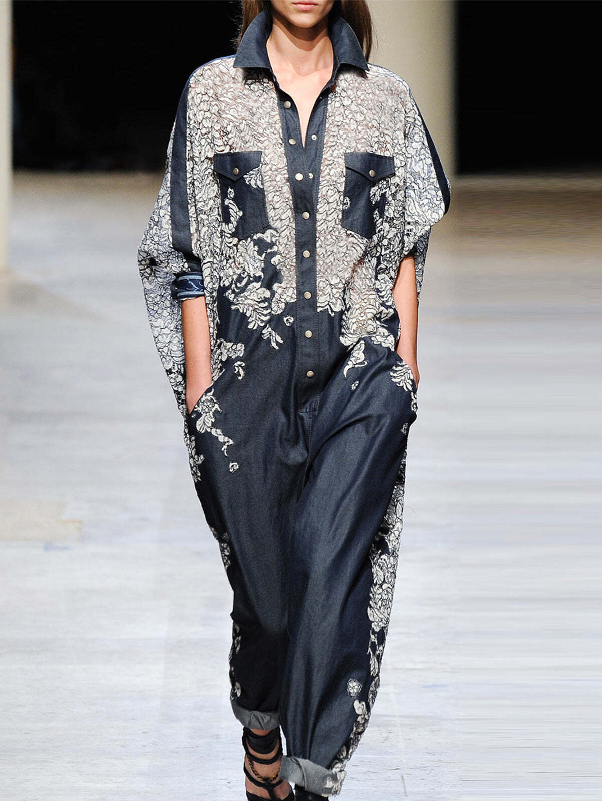 Fashion Floral Lapel Collar Long Sleeve Pocket Jumpsuit