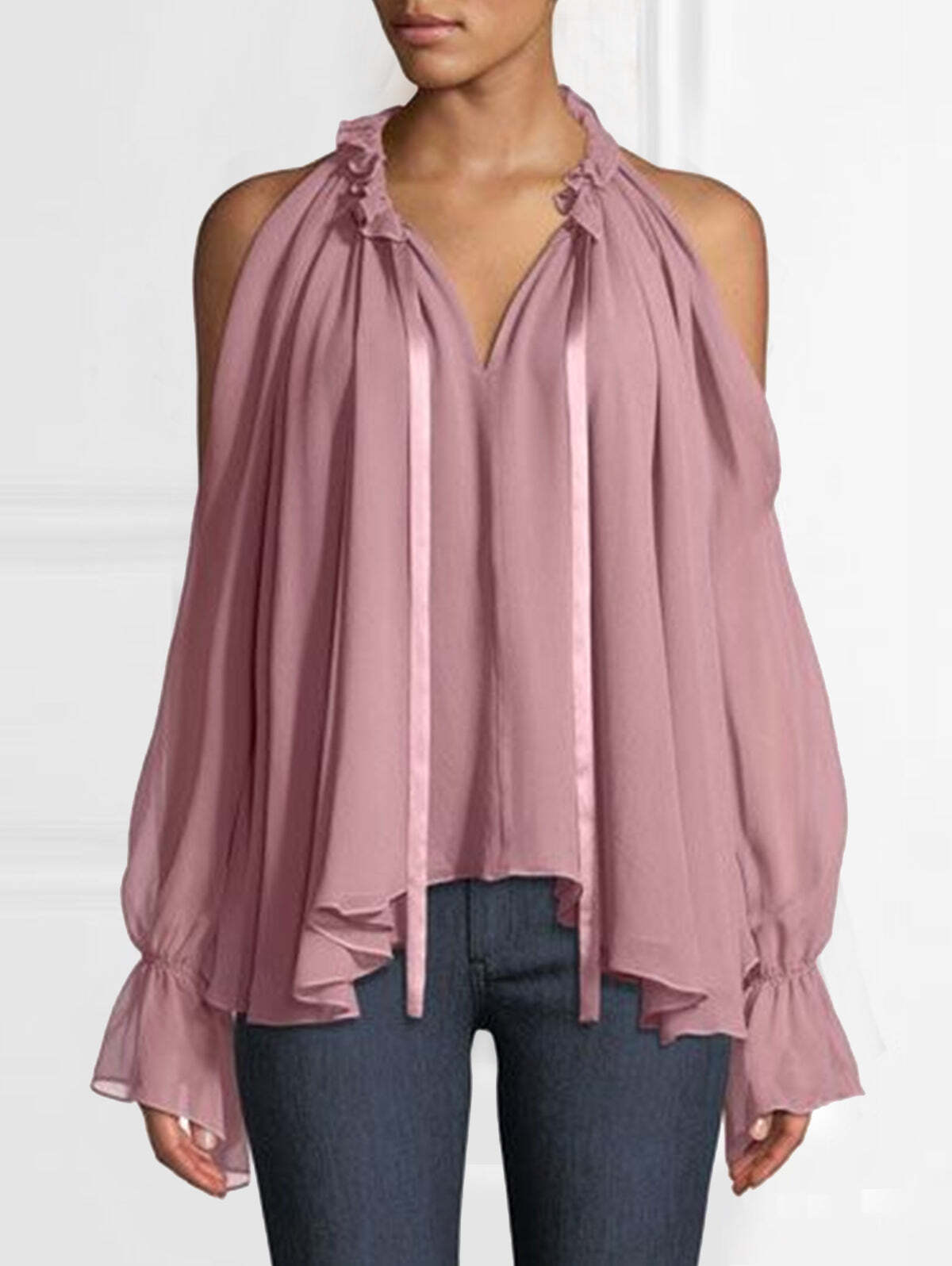 Elegant Plain Cold Shoulder Long Sleeve Ruffle Gathered Blouse