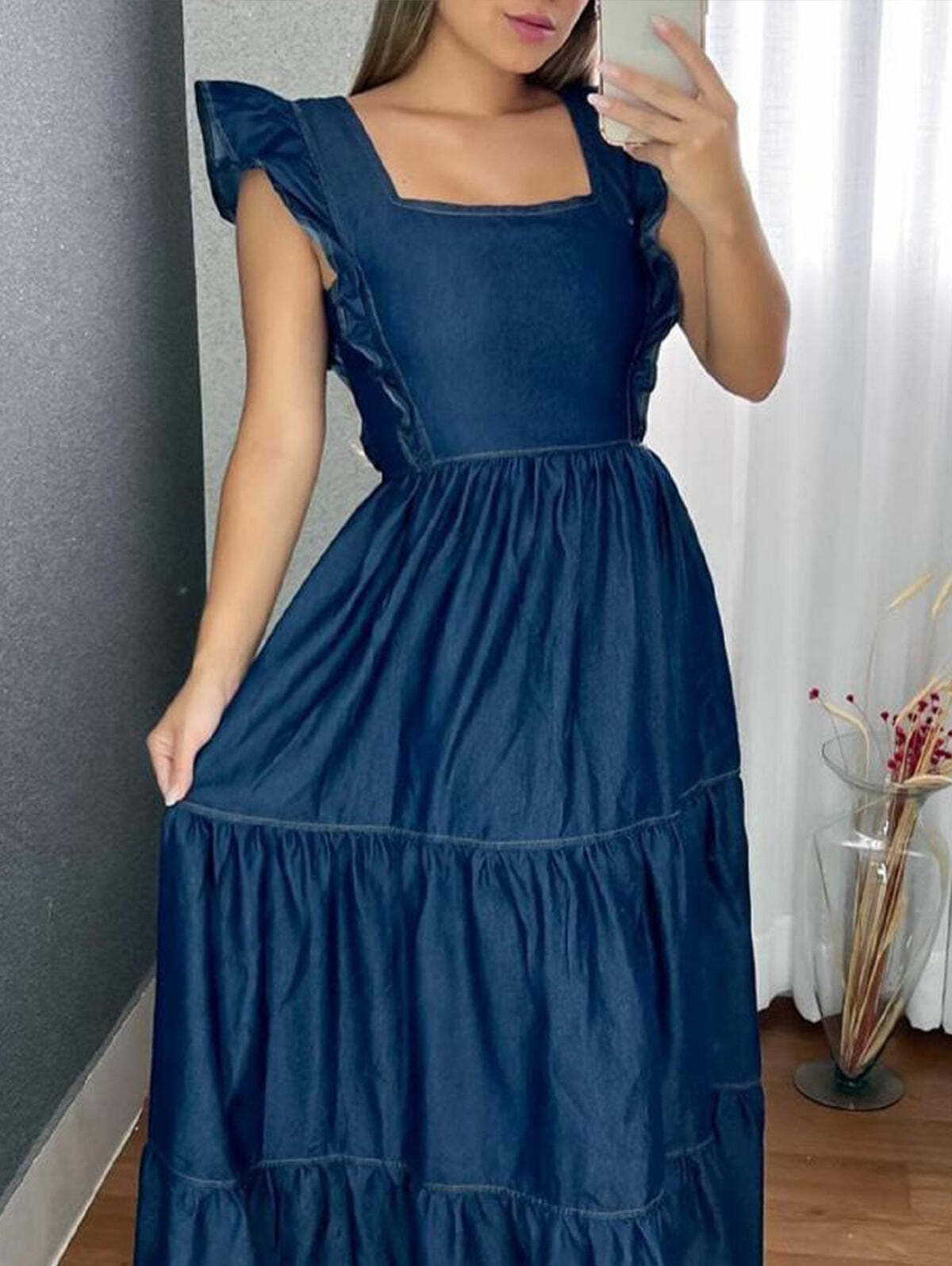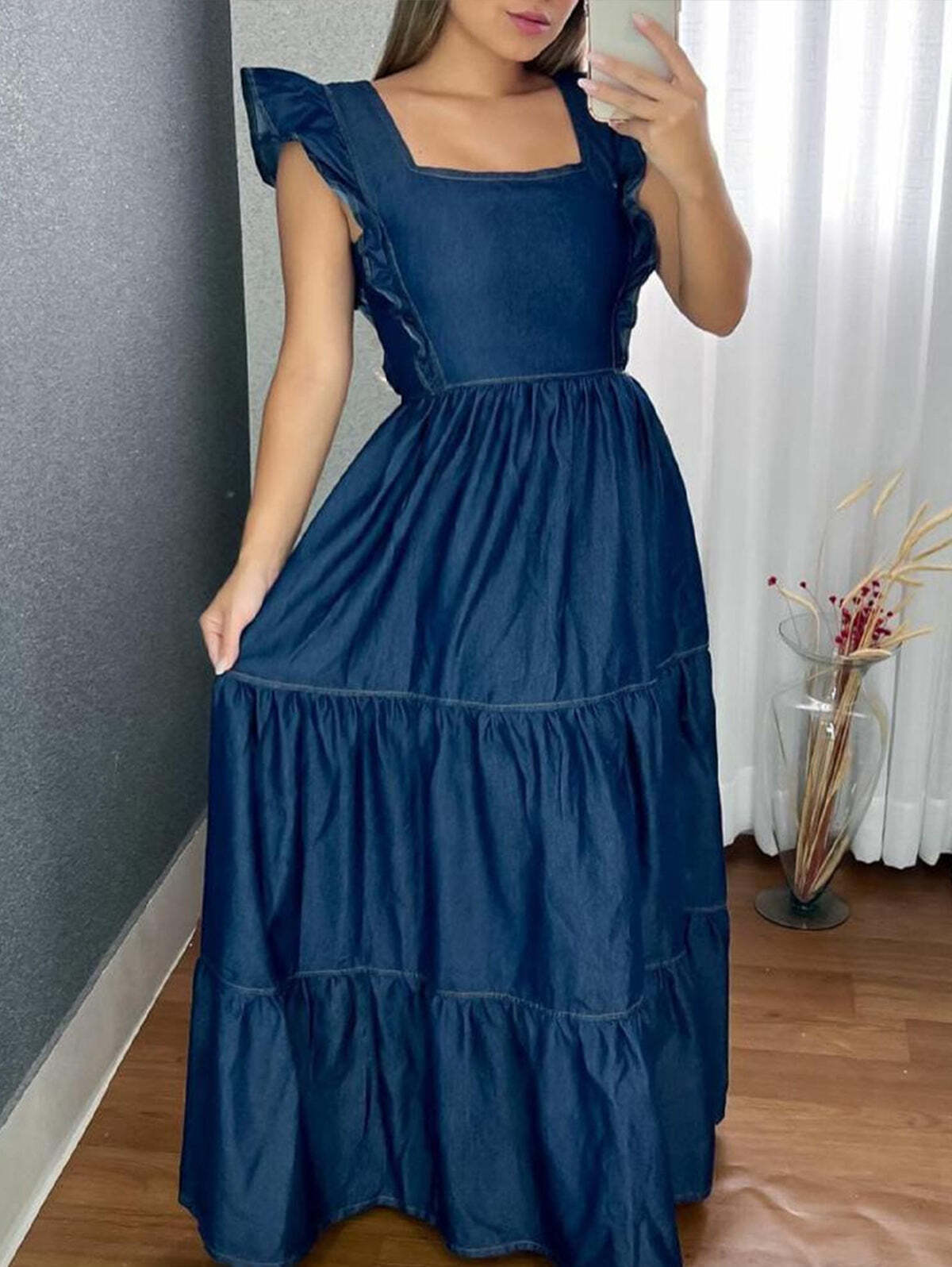 Elegant Plain Ruffle Trim Sleeveless Tiered Hem Maxi Dress