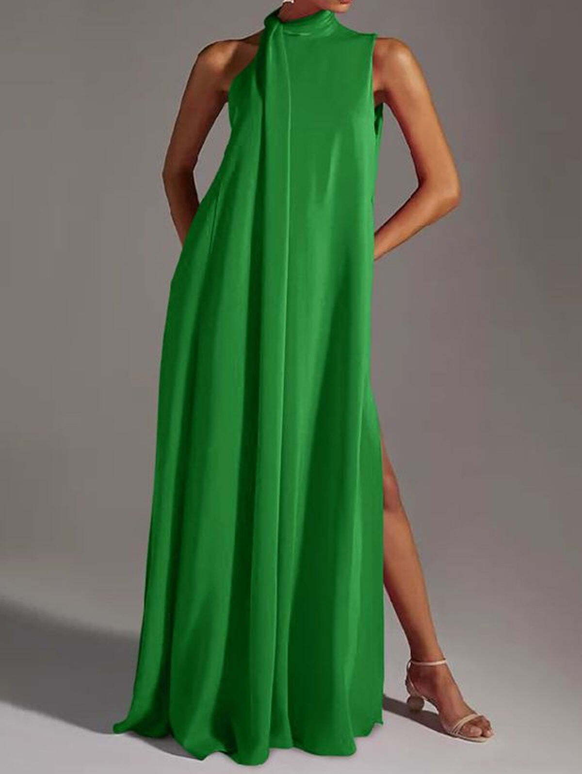 Elegant Plain Stand Collar Loose Slit Maxi Tank Dress