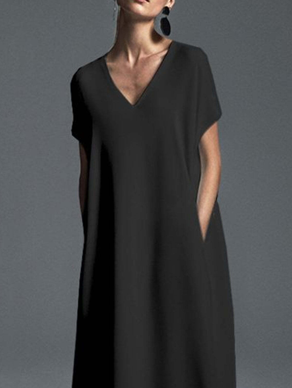 • Elegant Plain Floral V Neck Short Sleeve Loose Pocket Maxi Shift Dress